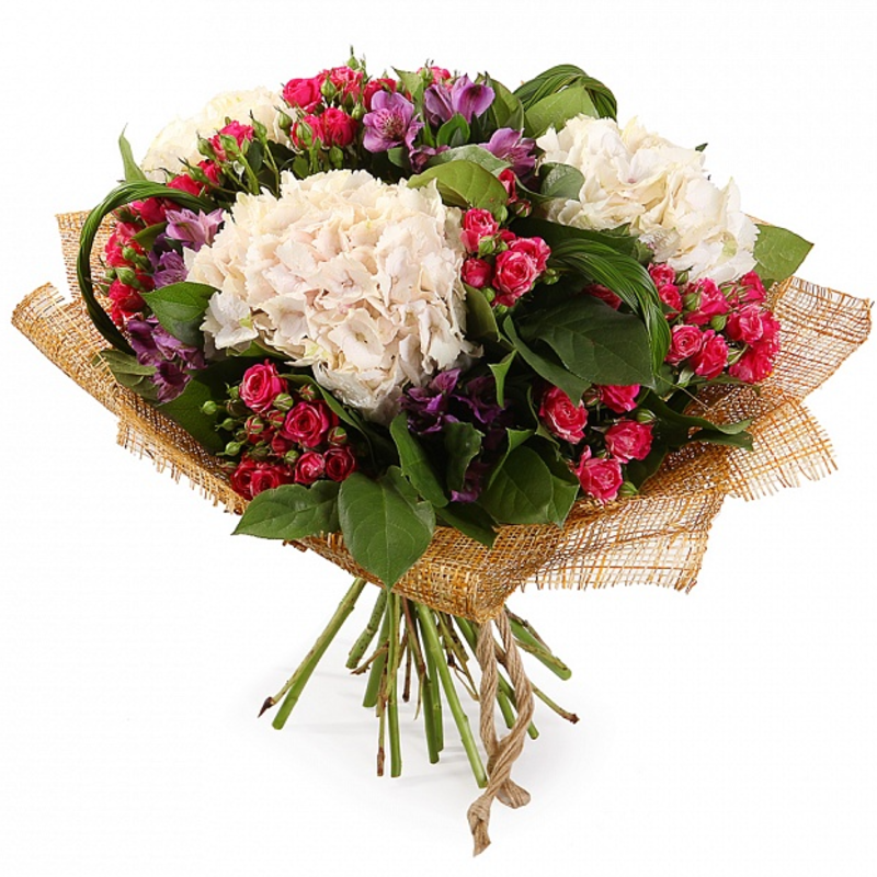 Альстромерия 5 шт., Гортензия 3 шт., Роза кустовая 9 шт. |