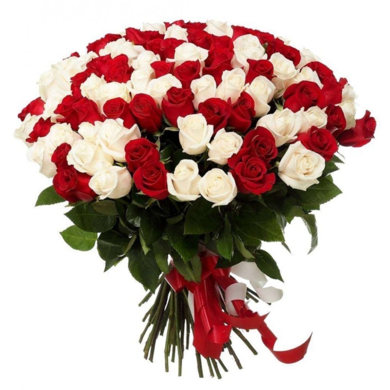 Букет состоит из 51 белая роза, 50 красных роз, прозрачная упаковка, белая и красная лента.