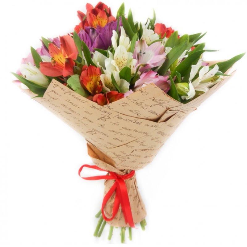 Букет состоит из 11 альстромерий, зелень, крафт, атласная лента.