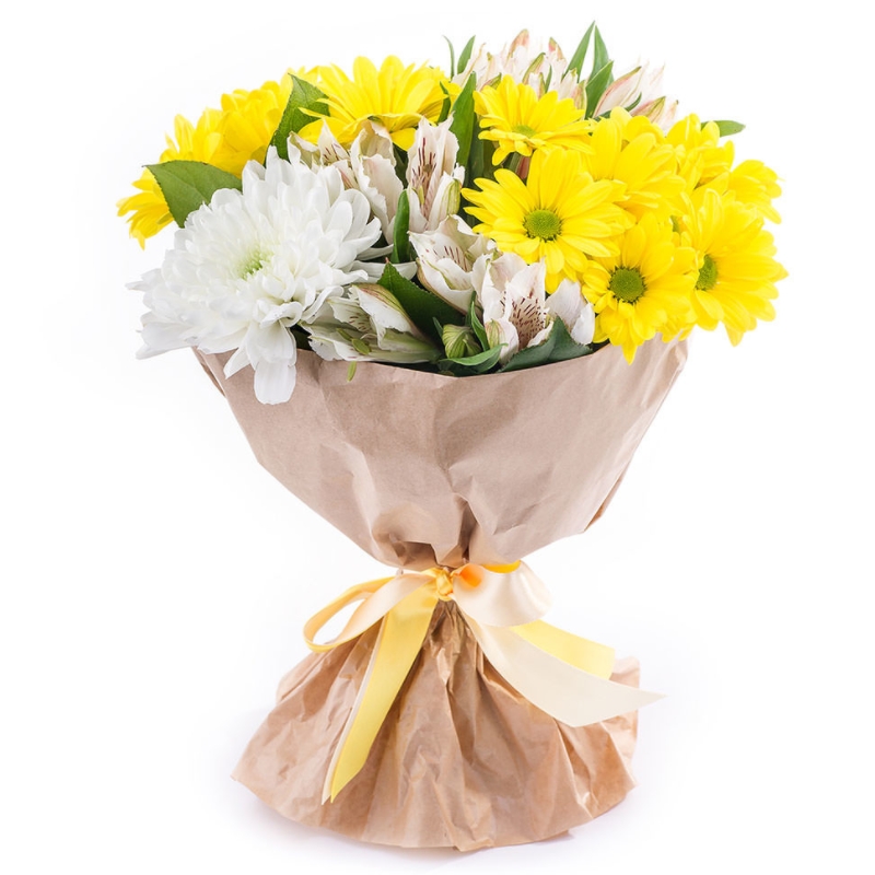 Букет состоит из 2 ветки желтых хризантем, 2 альстромерии, 1 белая хризантема, крафт, атласная лента.