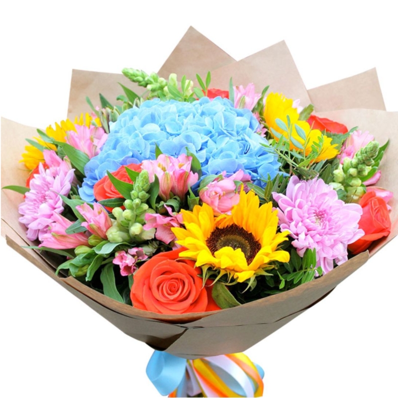 Букет состоит из 1 гортензия, 6 роз, 3 подсолнуха, 2 альстромерии, 5 хризантем, декоративная зелень, красивая упаковка, атласная лента.