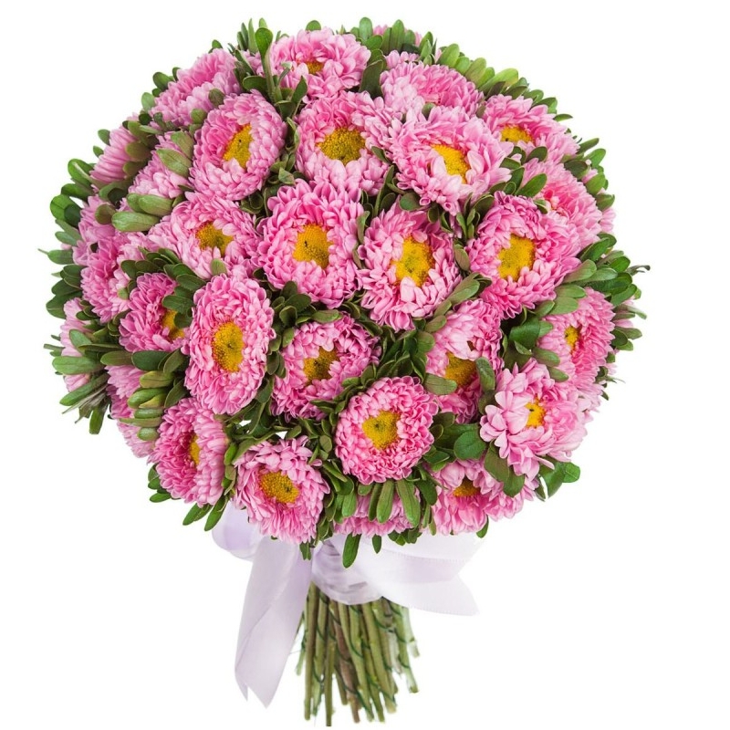 Букет состоит из 51 розовая астра, зелень, прозрачная упаковка, атласная лента.