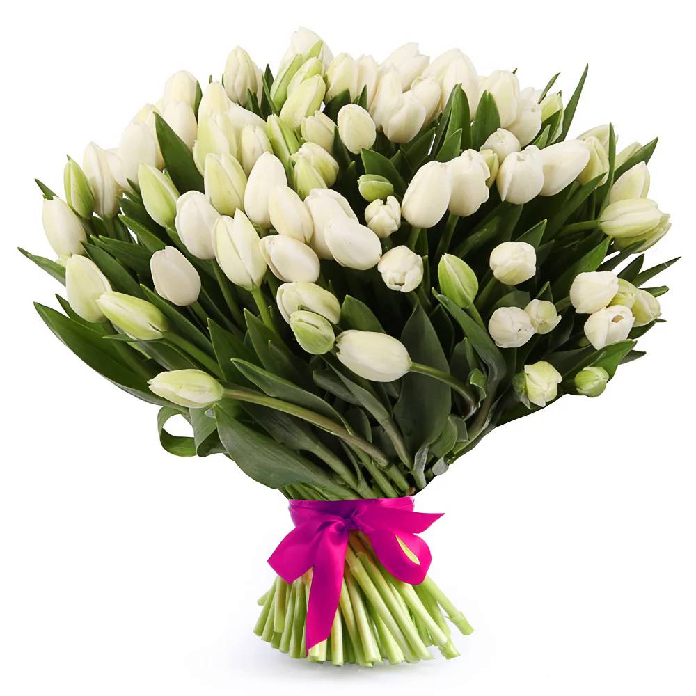Букет состоит из 101 белый тюльпан, прозрачная упаковка, атласная лента.