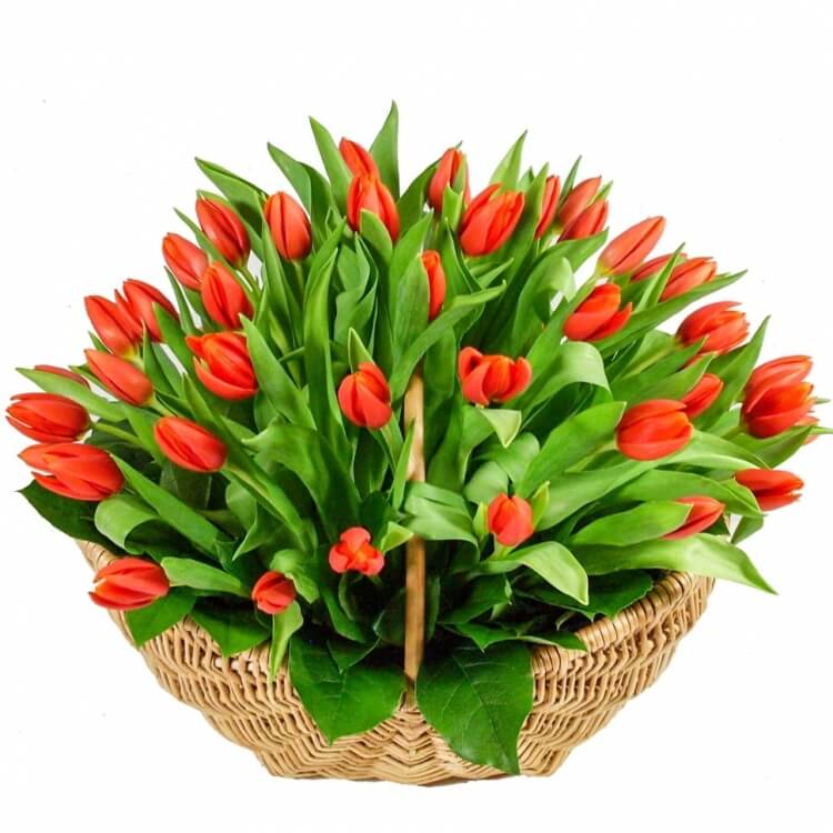 Красные тюльпаны в корзине 101 шт