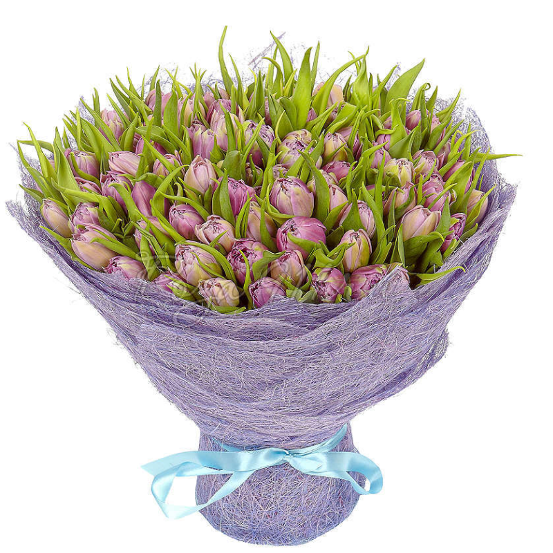 Букет состоит из 101 сиреневый тюльпан, красивая упаковка, атласная лента.