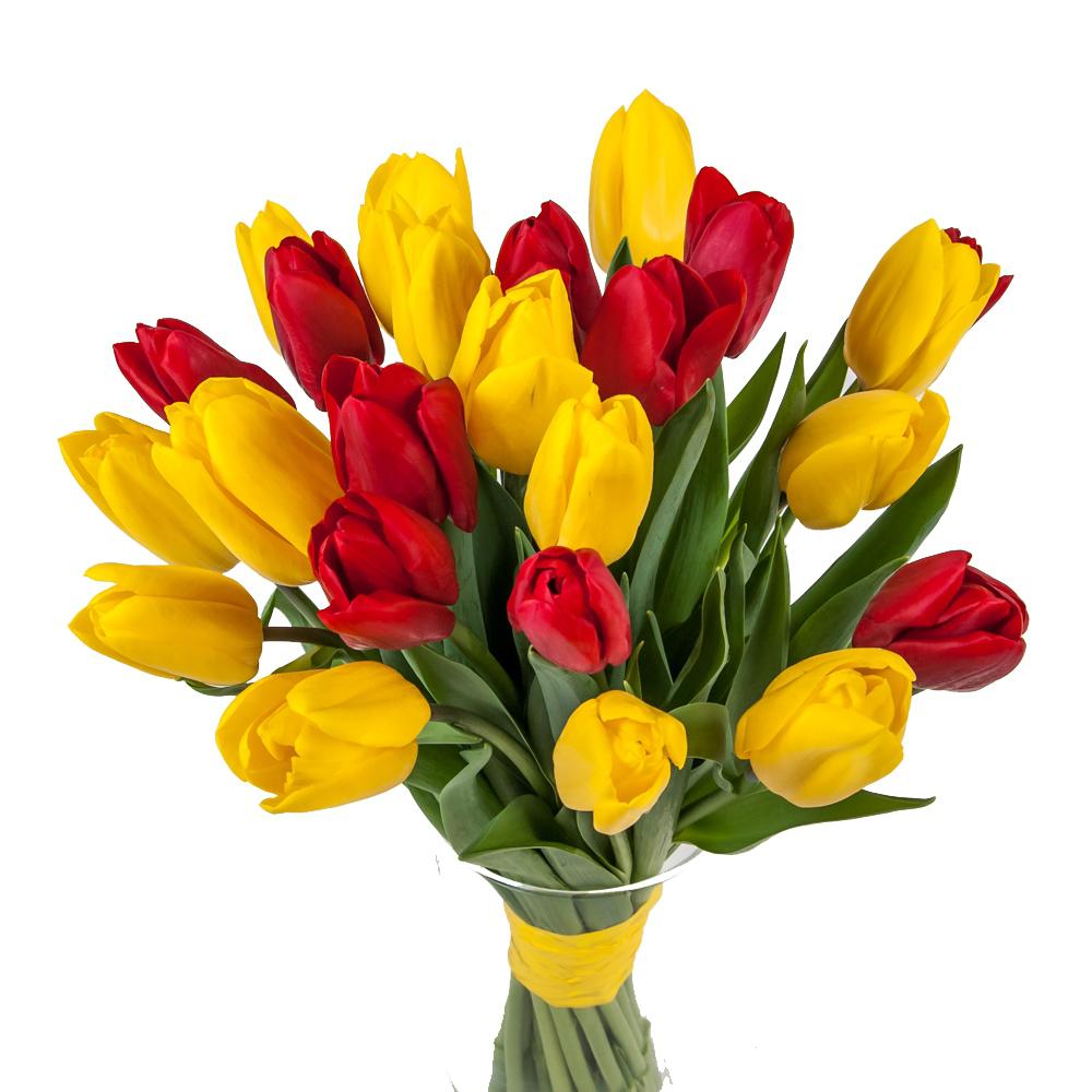 Букет состоит из 13 желтых тюльпанов, 12 красных тюльпанов, прозрачная упаковка.