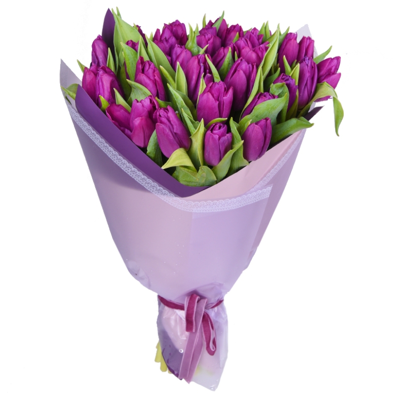 Букет состоит из 35 сиреневых тюльпанов, красивая упаковка, атласная лента.