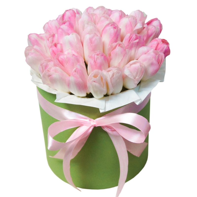 Букет состоит из 35 розовых тюльпанов, коробка, атласная лента, оазис.