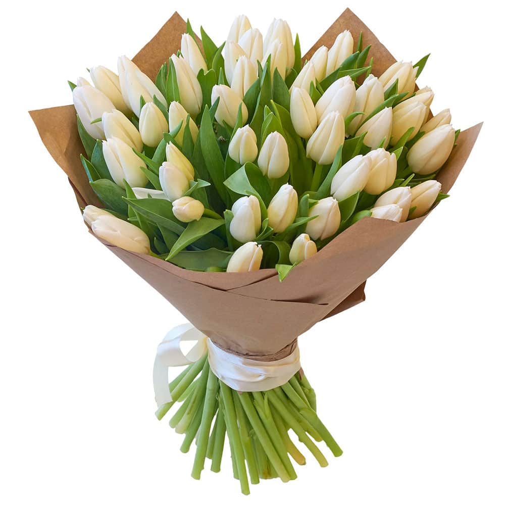 Букет состоит из 51 белый тюльпан, крафт, белая лента.