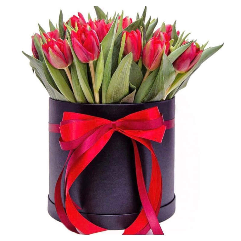 Букет состоит из 51 красный тюльпан, коробка, атласная лента, оазис.