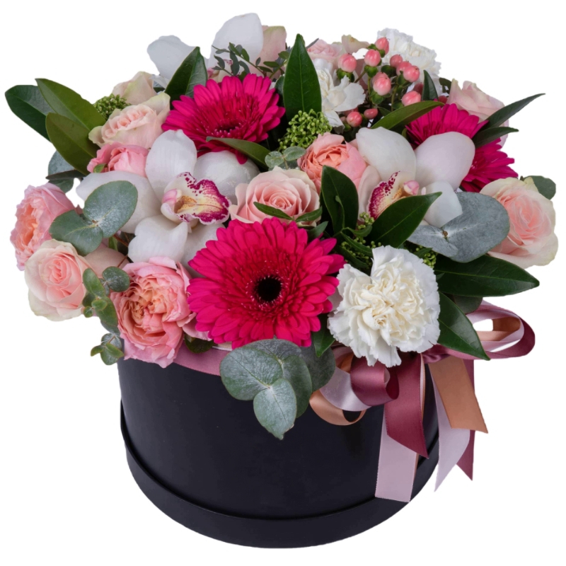 Гвоздика, Гербера, Гиперикум, Орхидея, Роза, Скиммия |