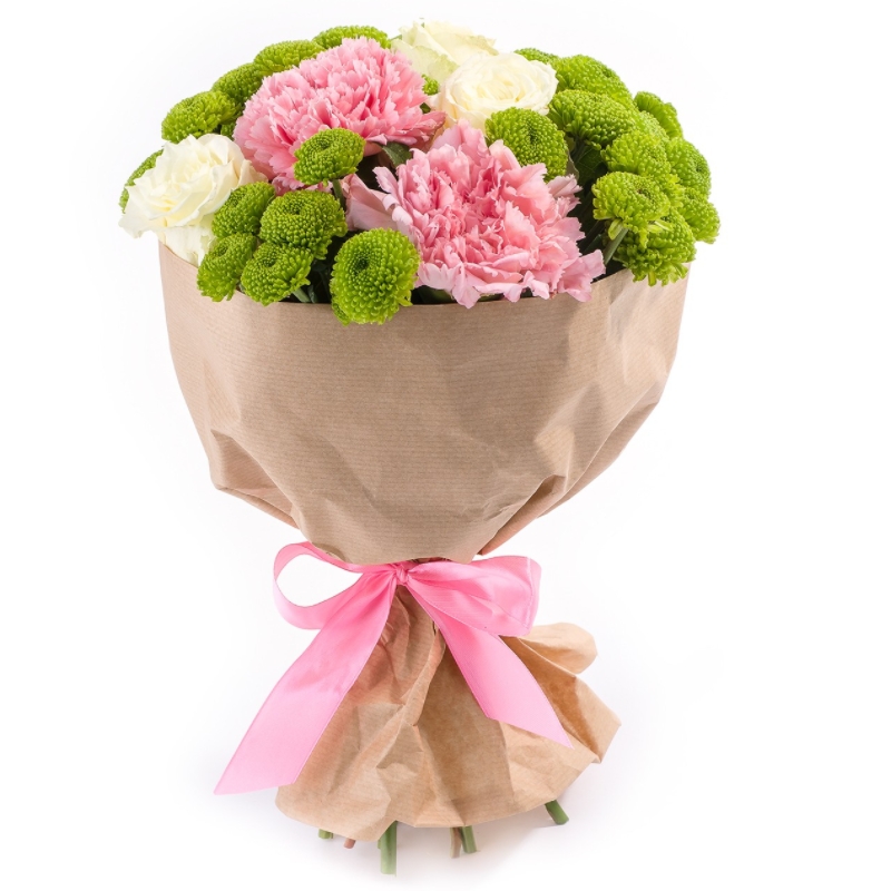 Букет состоит из 3 гвоздики, 3 розы, 3 ветки хризантемы, крафт, атласная лента.