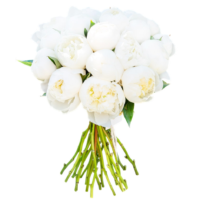 Букет состоит из 21 белый пион, прозрачная упаковка, атласная лента.