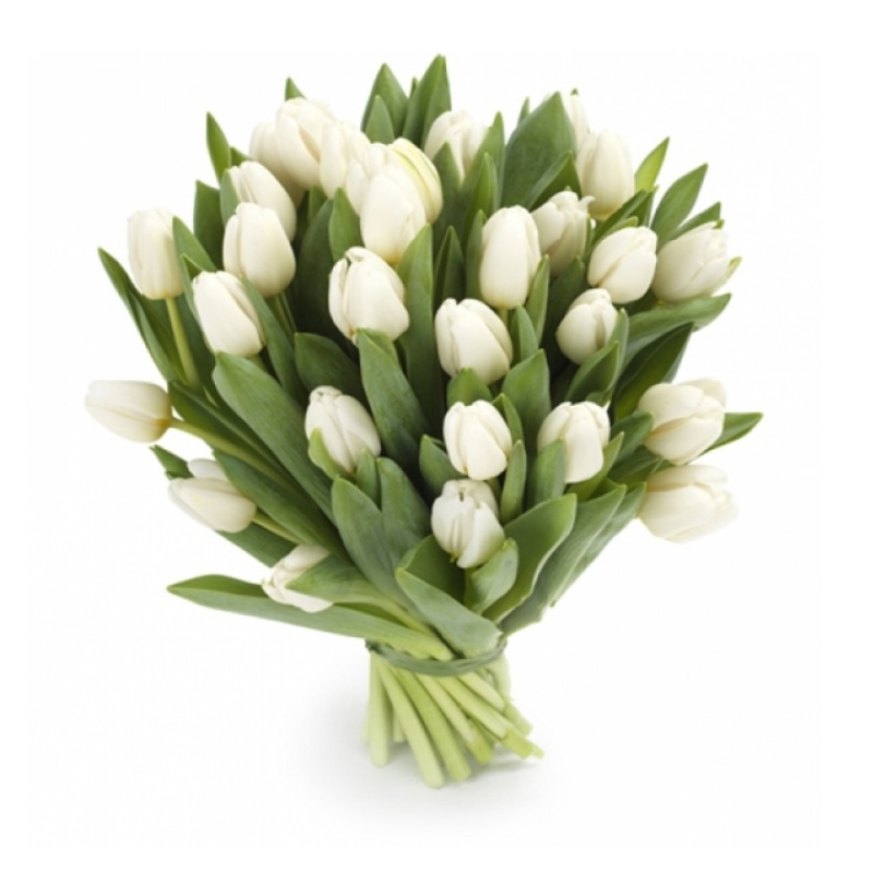 Букет состоит из 29 белых тюльпанов, прозрачная упаковка.