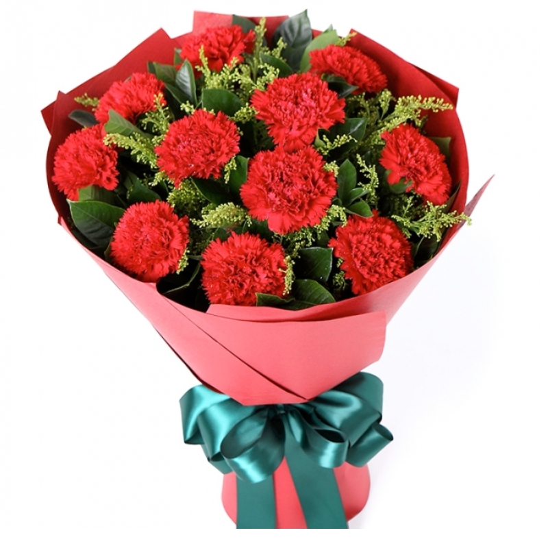 Букет состоит из 11 красных гвоздик, зелень, крафт, атласная лента.