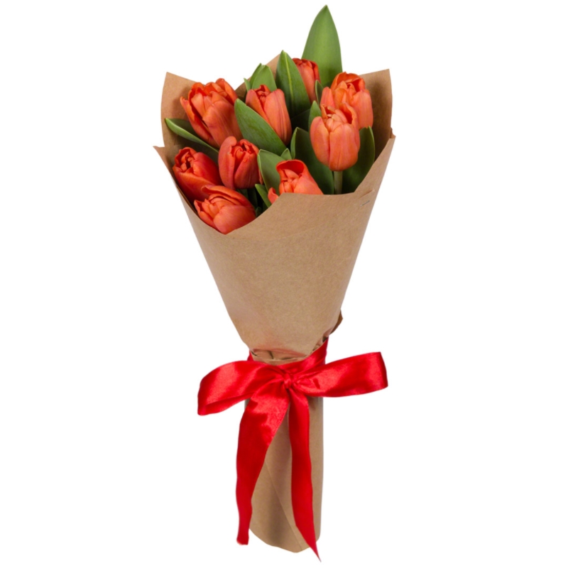 Букет состоит из 9 красных тюльпанов, крафт, атласная лента.