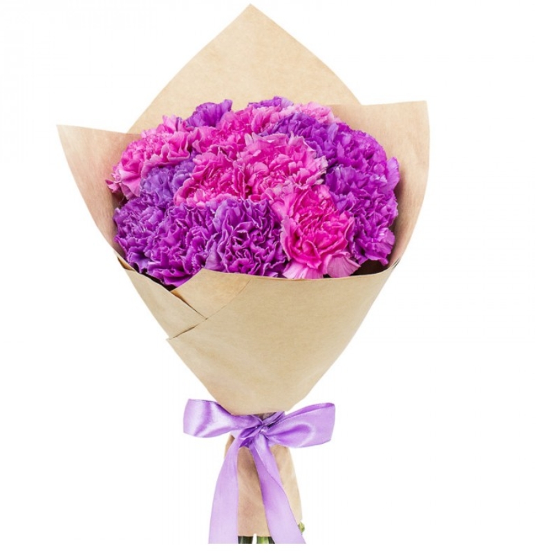 Букет состоит из 8 сиреневых гвоздик, 7 розовых гвоздик, крафт, атласная лента.