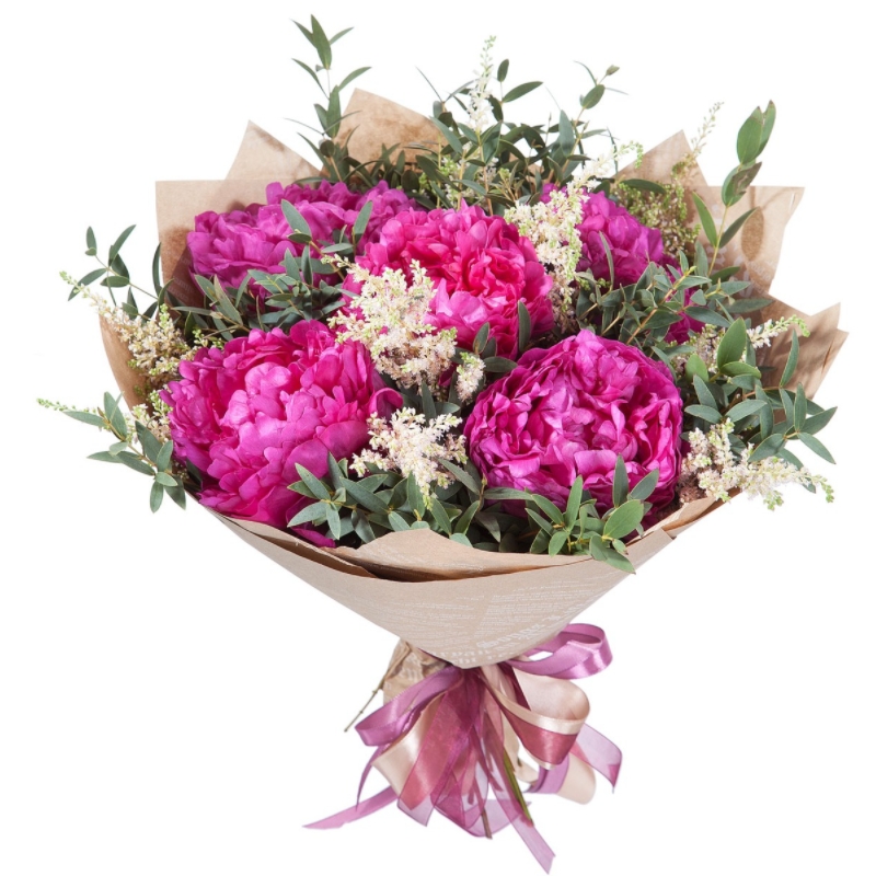 Букет состоит из 5 пионов, декоративная зелень, крафт, атласная лента.