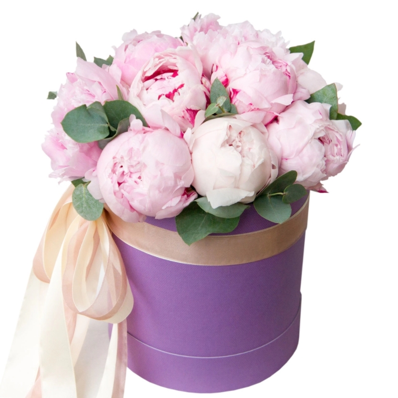 Букет состоит из 11 розовых пионов, зелень, коробка, атласная лента, оазис.