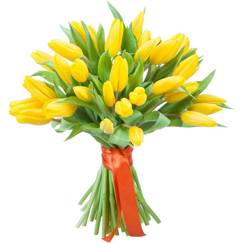Букет состоит из 31 желтый тюльпан, прозрачная упаковка, атласная лента.