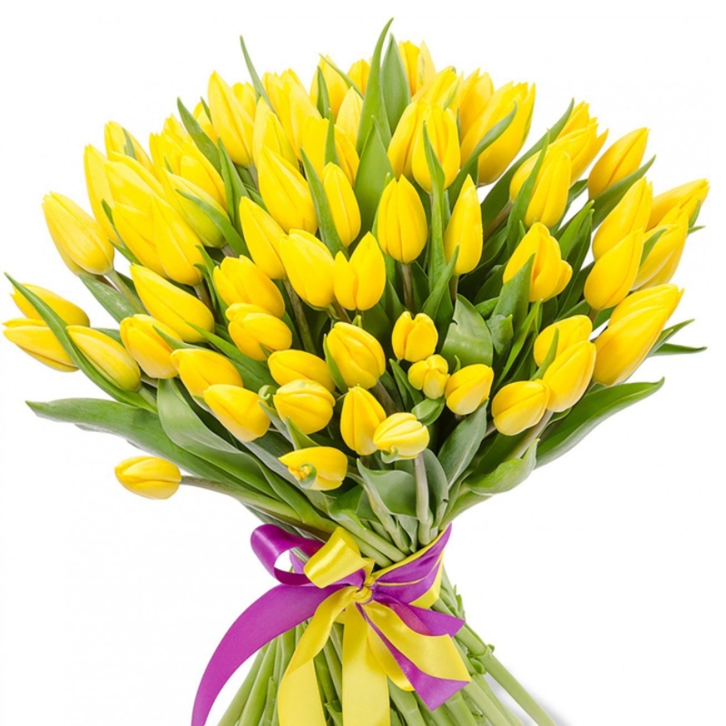 Букет состоит из 75 желтых тюльпанов, прозрачная упаковка, атласная лента.