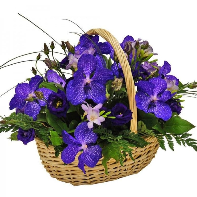 Букет состоит из 7 орхидей, 4 ветки эустомы, 4 фрезии, зелень, корзина, оазис.