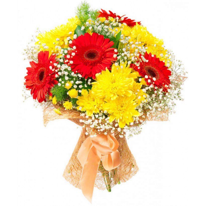 Букет состоит из 5 красных гербер, 4 ветки желтой хризантемы, 3 гипсофила, зелень, красивая упаковка, атласная лента.