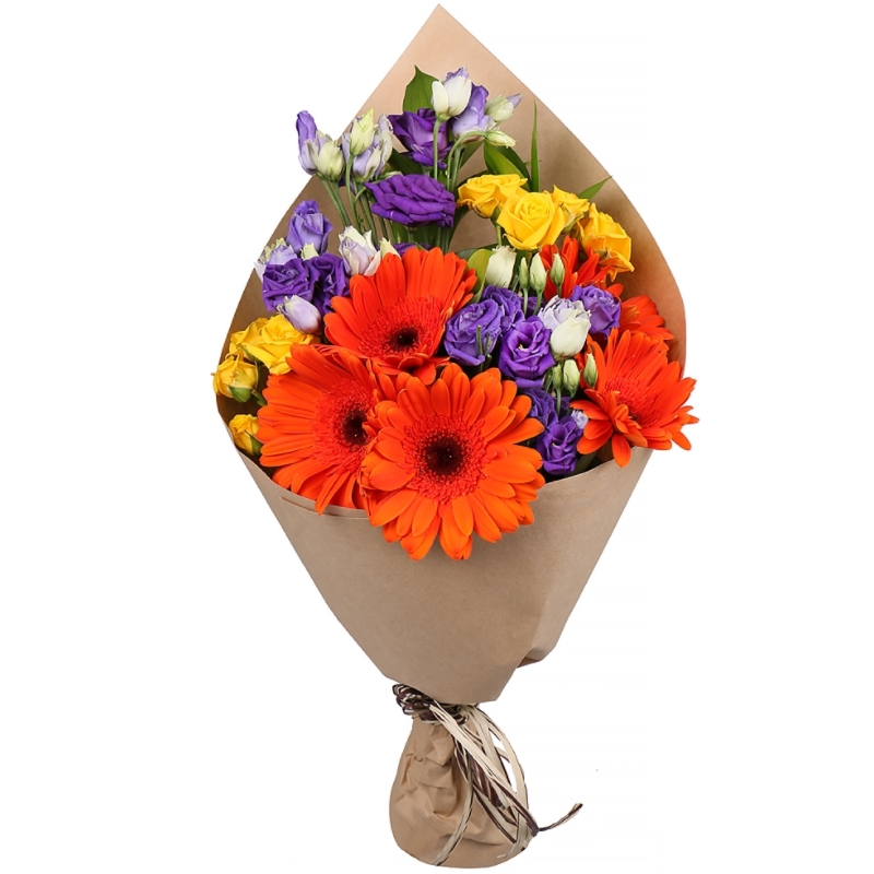 Букет состоит из 5 оранжевых гербер, 2 ветки желтой кустовой розы, 3 эустомы, крафт, атласная лента.