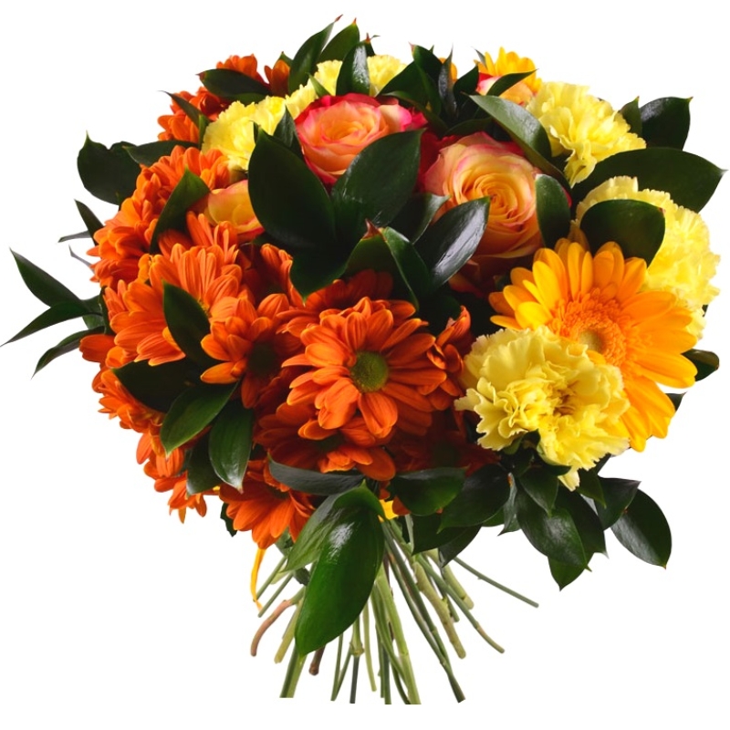 Букет состоит из 5 жёлтых гвоздик, 3 оранжевых хризантем, 4 жёлтых гербера, 3 коралловых розы, зелень, прозрачная упаковка, атласная лента.
