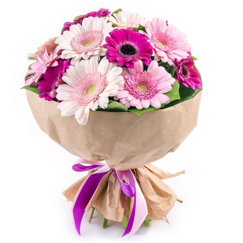 Букет состоит из MIX из 11 гербер, крафт, атласная лента.
