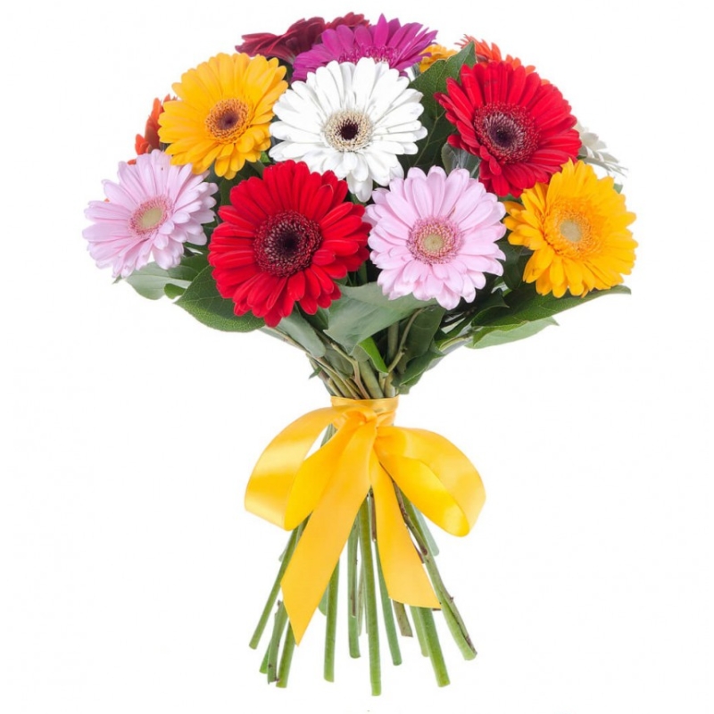 Букет состоит из MIX из 17 гербер, прозрачная упаковка, атласная лента.
