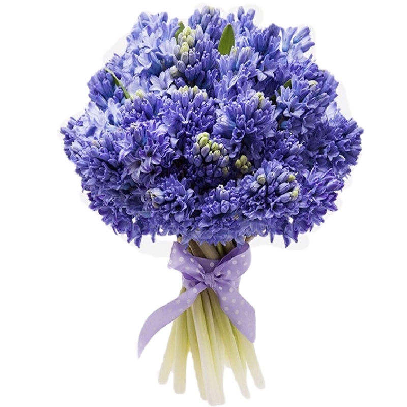 Букет состоит из 25 синих гиацинтов, прозрачная упаковка, атласная лента.