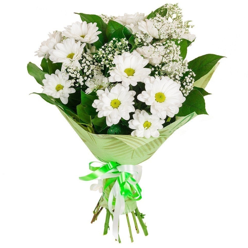 Букет состоит из 3 ветки белой хризантемы, 2 ветки гипсофилы, зелень, красивая упаковка, атласная лента.