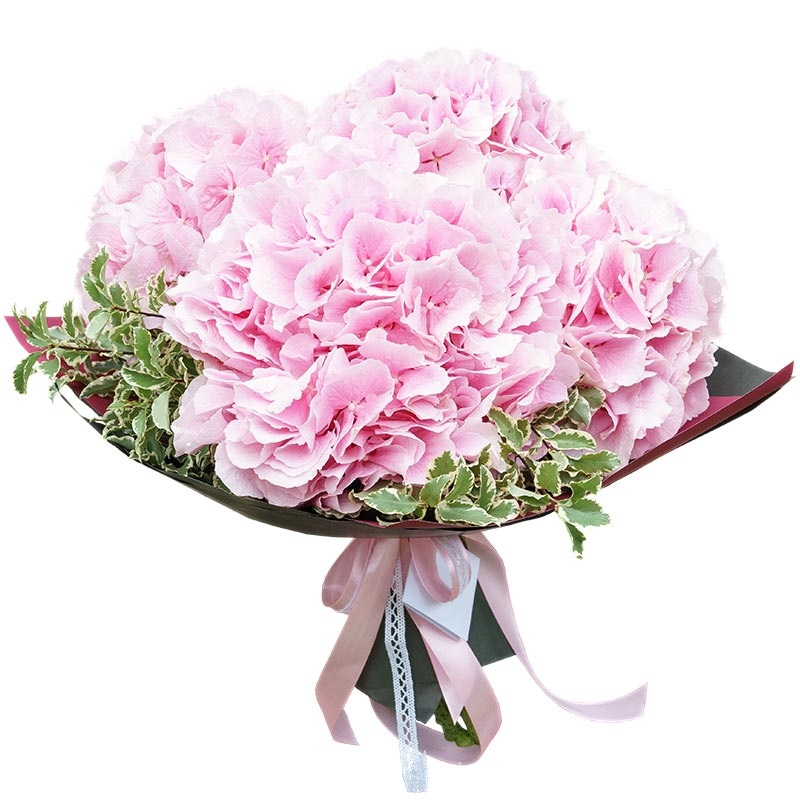 Букет состоит из 5 розовых гортензий, зелень, крафт, атласная лента.