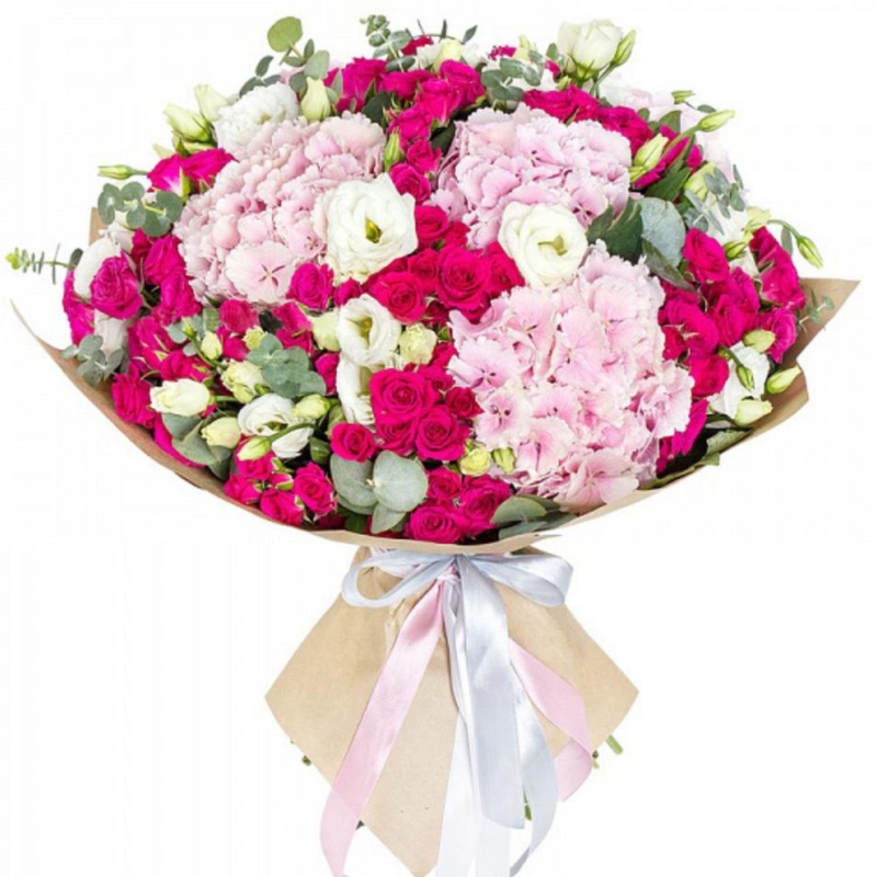 Букет состоит из 3 розовые гортензии, 20 красных кустовых роз, 10 веток эустомы, зелень, крафт, атласная лента.