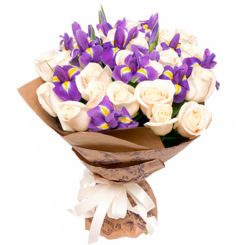 Букет из белых роз и ирисов в крафте