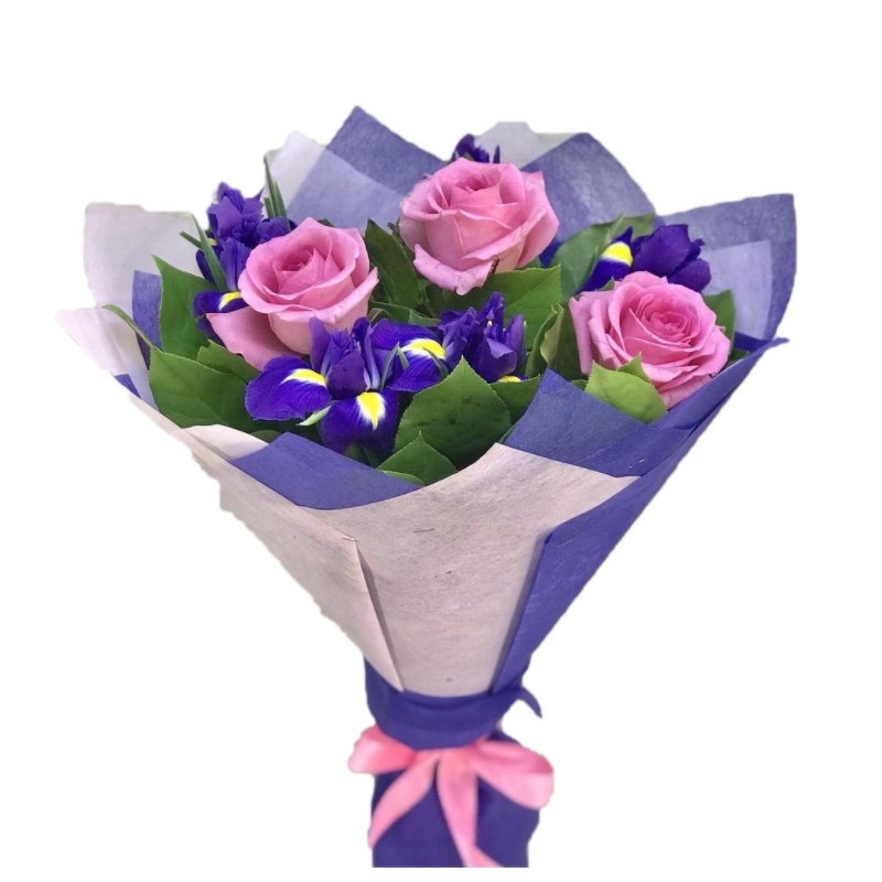 Букет состоит из 3 розовые розы, 6 ирисов, зелень, красивая упаковка, атласная лента.