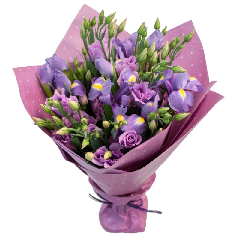 Букет состоит из 10 ирисов, 7 веток фиолетовой эустомы, красивая упаковка, атласная лента.
