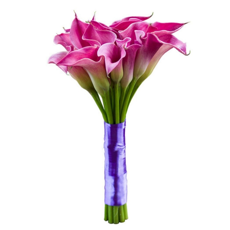 Букет состоит из 19 розовых калл, прозрачная упаковка, атласная лента.