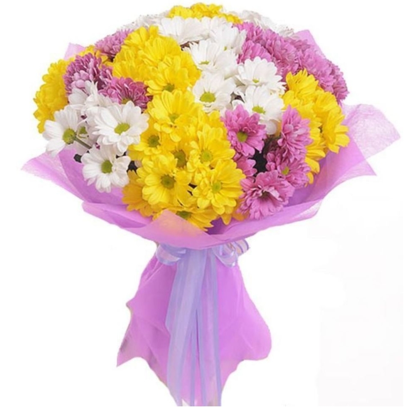 Букет состоит из 5 веток белой хризантемы, 5 веток желтой хризантемы, 5 веток розовой хризантемы , красивая упаковка, атласная лента.