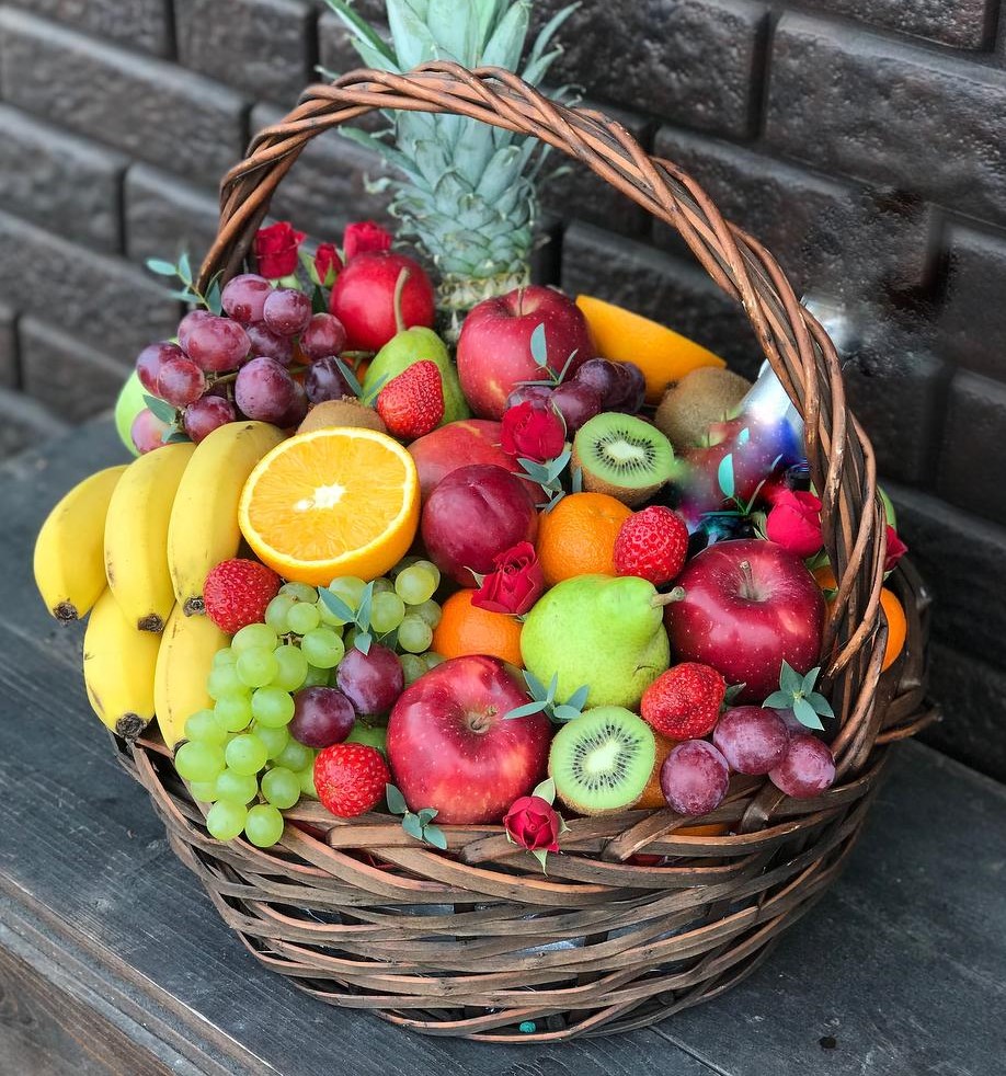 фруктовая композиция в корзине из винограда, бананов, груш, яблок, слив, клубники, мандарин и ананаса. 7 кг.
