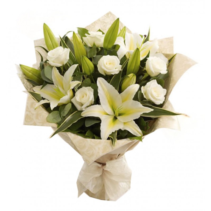 Букет состоит из 3 белых лилии, 9 белых роз, крафт, атласная лента.