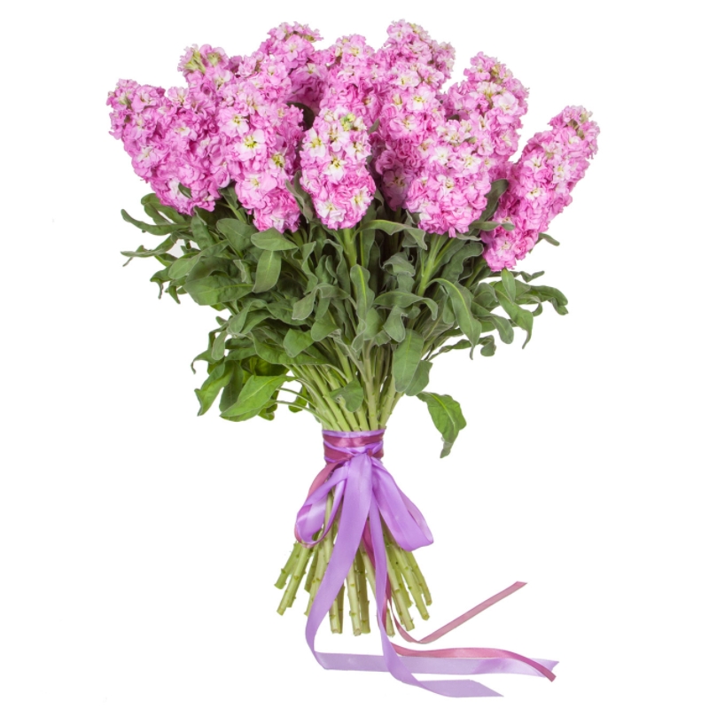 Букет состоит из 21 розовая маттиола, прозрачная упаковка, атласная лента.