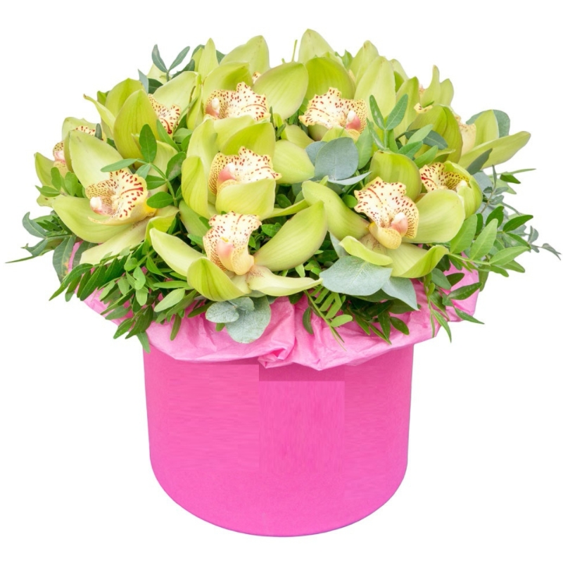 Букет состоит из 15 орхидей, зелень, коробка, оазис.