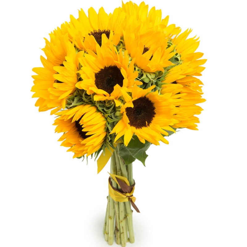 Букет состоит из 11 подсолнухов, прозрачная упаковка, атласная лента.