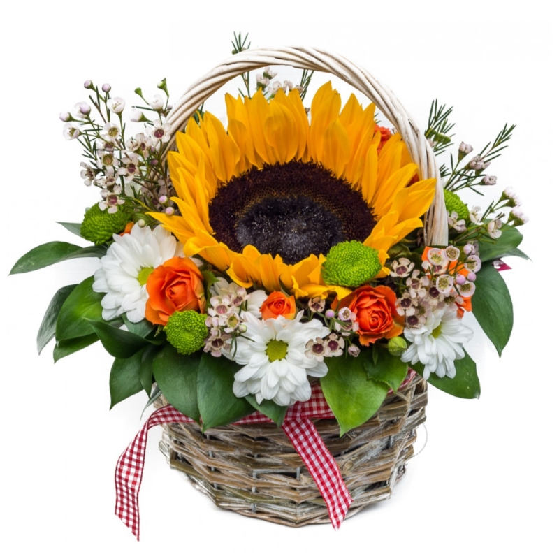 Букет состоит из 1 подсолнух, 3 ветки ваксфлауэра, 3 кустовые розы, 4 ветки кустовых хризантем, зелень, корзина, оазис.