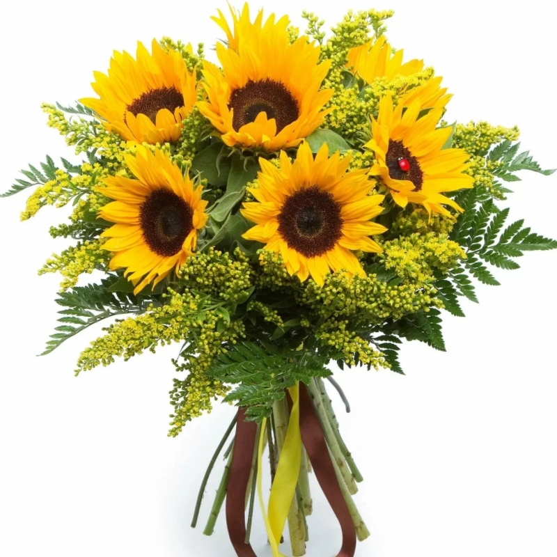 Букет состоит из 7 подсолнухов, 11 солидаго, зелень, прозрачная упаковка, атласная лента.