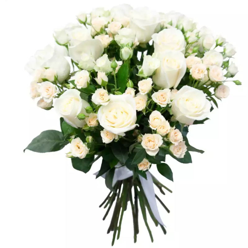 Букет состоит из 11 белых роз, 4 ветки кустовой розы, прозрачная упаковка, атласная лента.