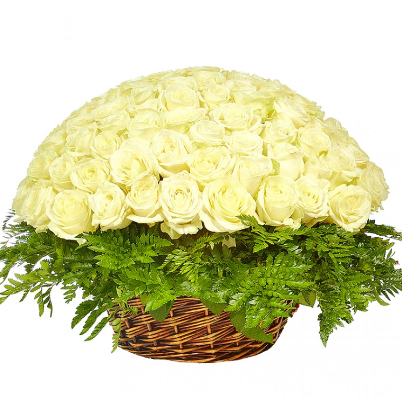 Корзина из 101 белой розы с зеленью