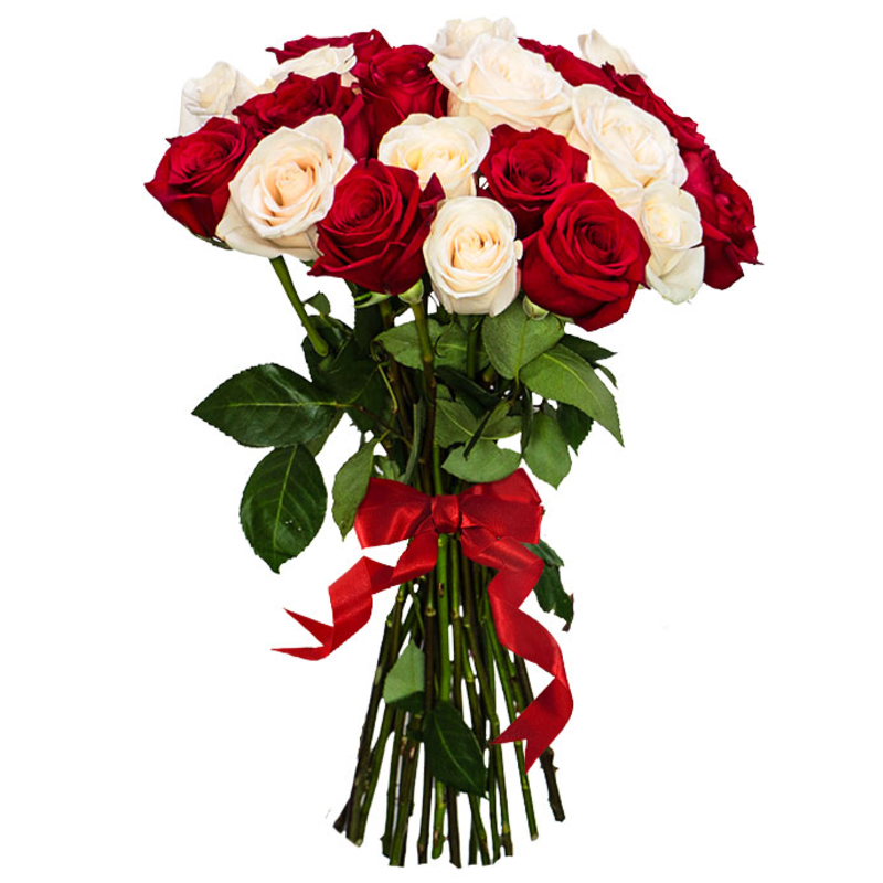 Букет состоит из 11 белых роз, 10 красных роз, прозрачная упаковка, атласная лента.
